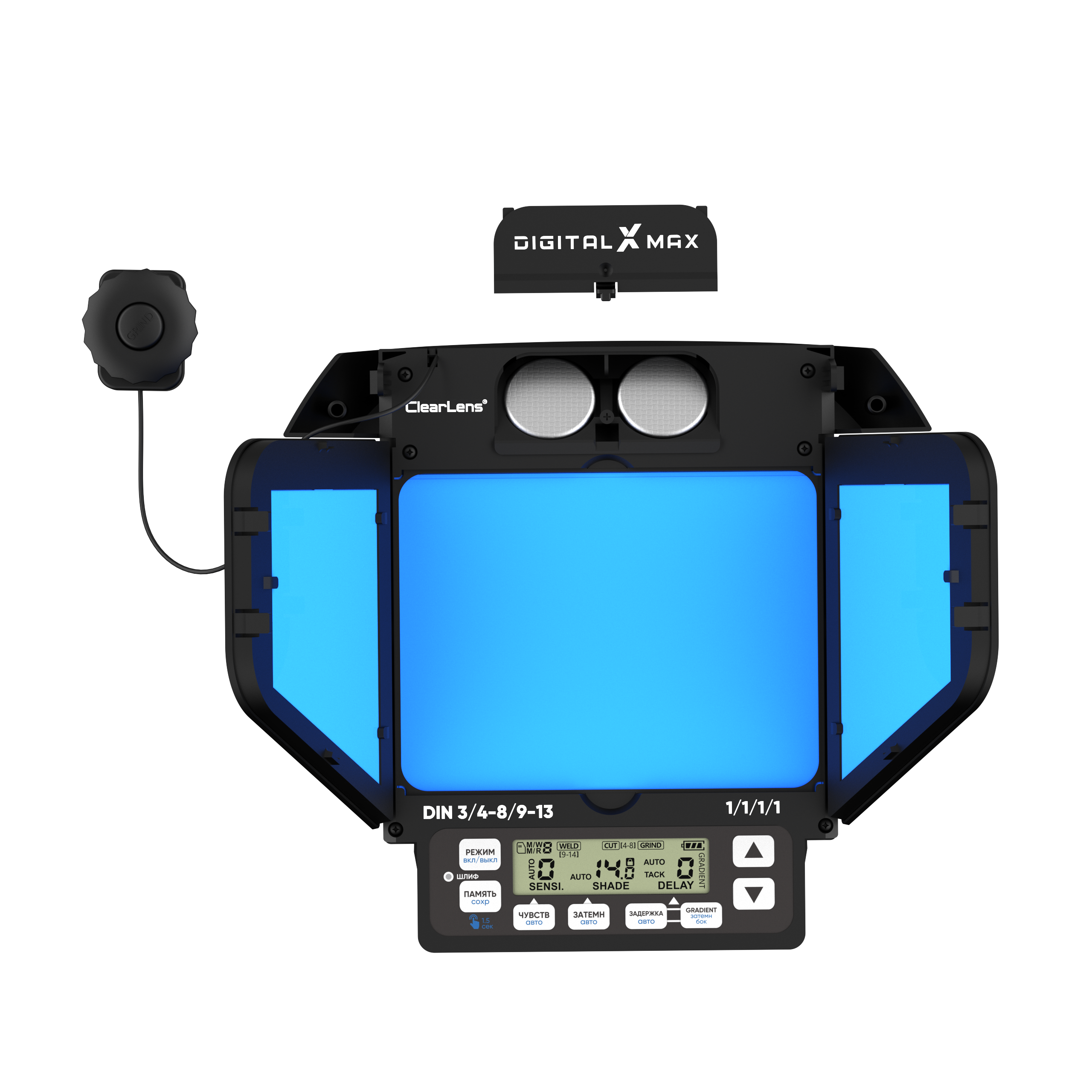 - Предусмотрены два режима для сварки ММА/MIG/ TIG (4-8; 9-13 DIN), а также резка CUT с фиксированным затемнение (4-8 DIN) и шлифовка GRIND (3 DIN);