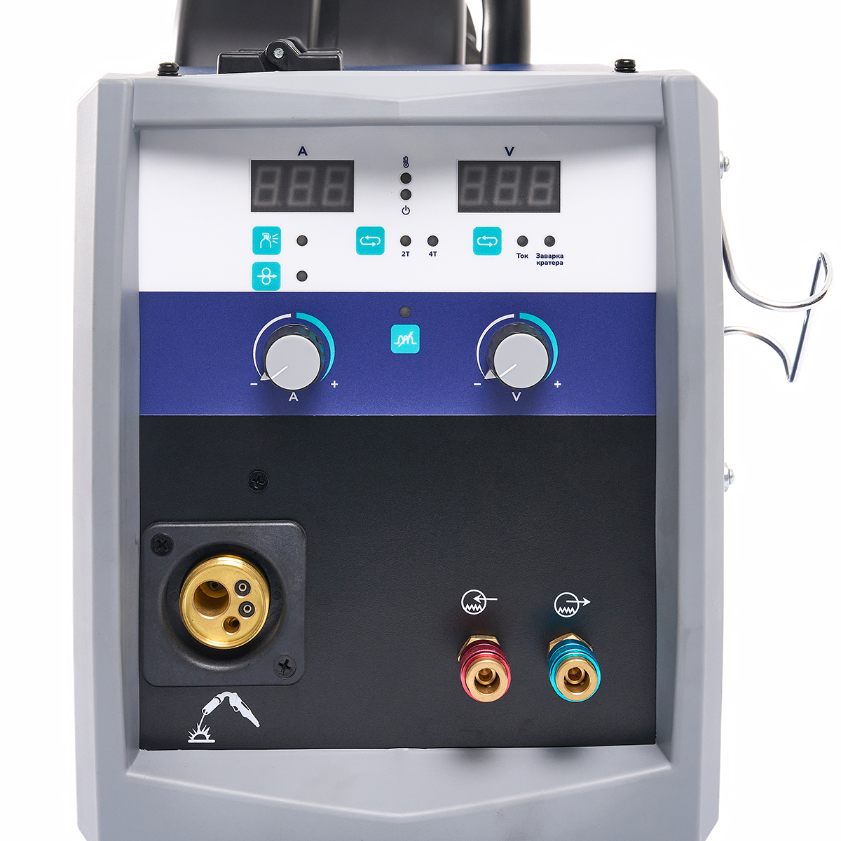 Большой цифровой дисплей отображает все параметры сварки — ток, напряжение, скорость подачи, выбранный режим, тип газа и диаметр проволоки. Навигация и регулировки интуитивны, что снижает время настройки аппарата и повышает контроль над процессом.